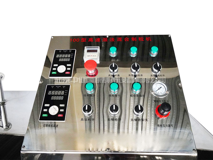 濕法混合制粒機(jī)主要由機(jī)體、鍋體、攪拌裝置、制粒刀、出料裝置、開蓋裝置、控制系統(tǒng)及充氣密封等輔助系統(tǒng)所組成,保障制粒全過程在良好的環(huán)境中完成??刂泼姘蹇刹捎闷胀ò存I或觸摸屏控制系統(tǒng),使操作更為方便直觀。